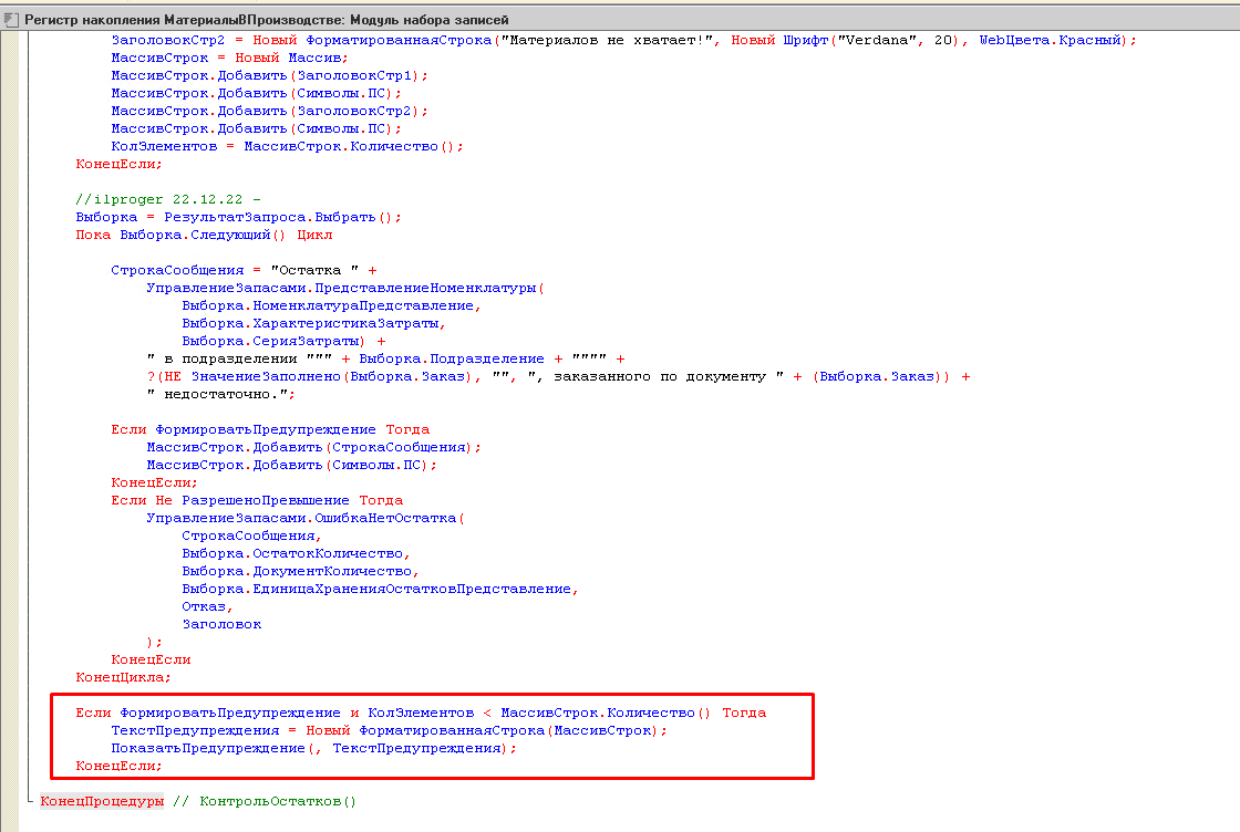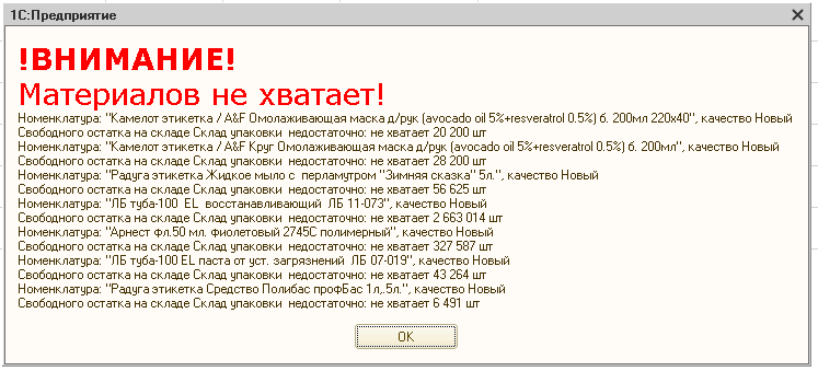 В УПП Была задача сделать так, чтобы если не хватает материалов при проведении "Требования-накладной" и "Отчета производства за смену" выдавалось крупное окно с информацией об этом помимо обычного служебного сообщения.