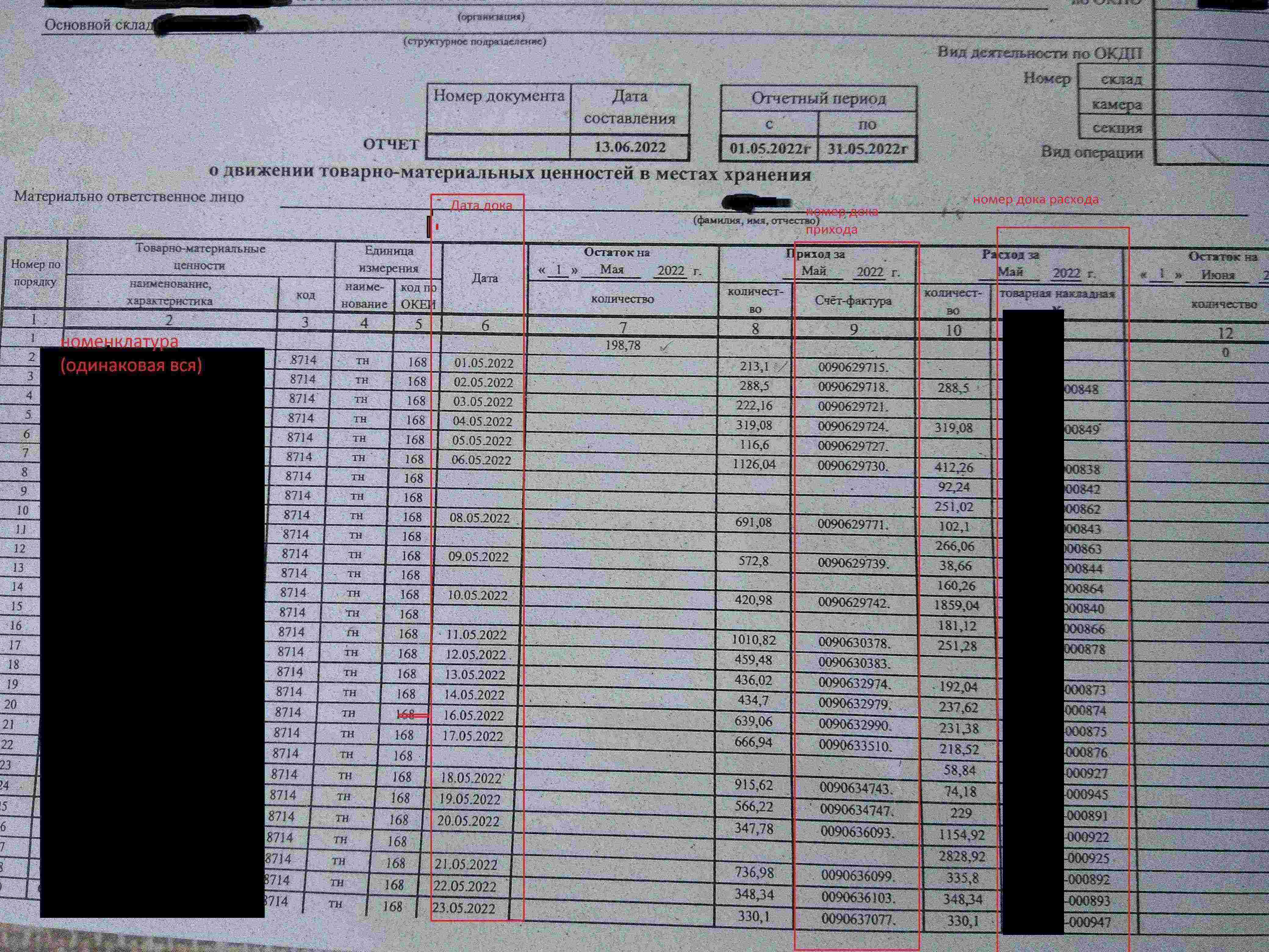 БП 3.0. Отчет Движение ТМЦ в местах хранения мх-20/мх-20а по Датам, номерам фактур и накладных