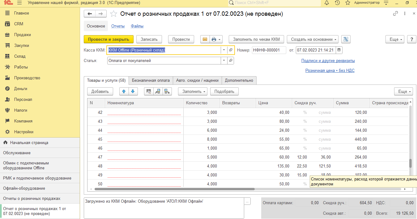 Все грузится в отчеты о розничных продаж стандартными средствами по обмену с оффлайн оборудованием, кроме самой номенклатуры. Просто пустые строки. Но есть кол-во, цена, сумма и тд.