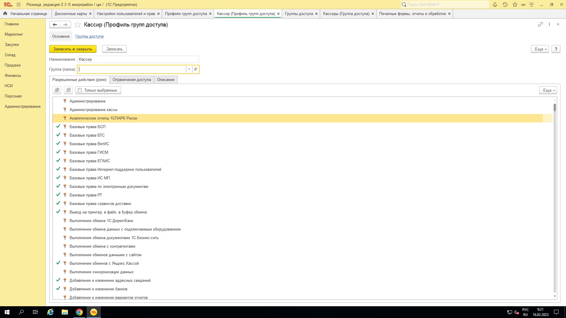 Для профиля групп доступа добавить разрешенные действия