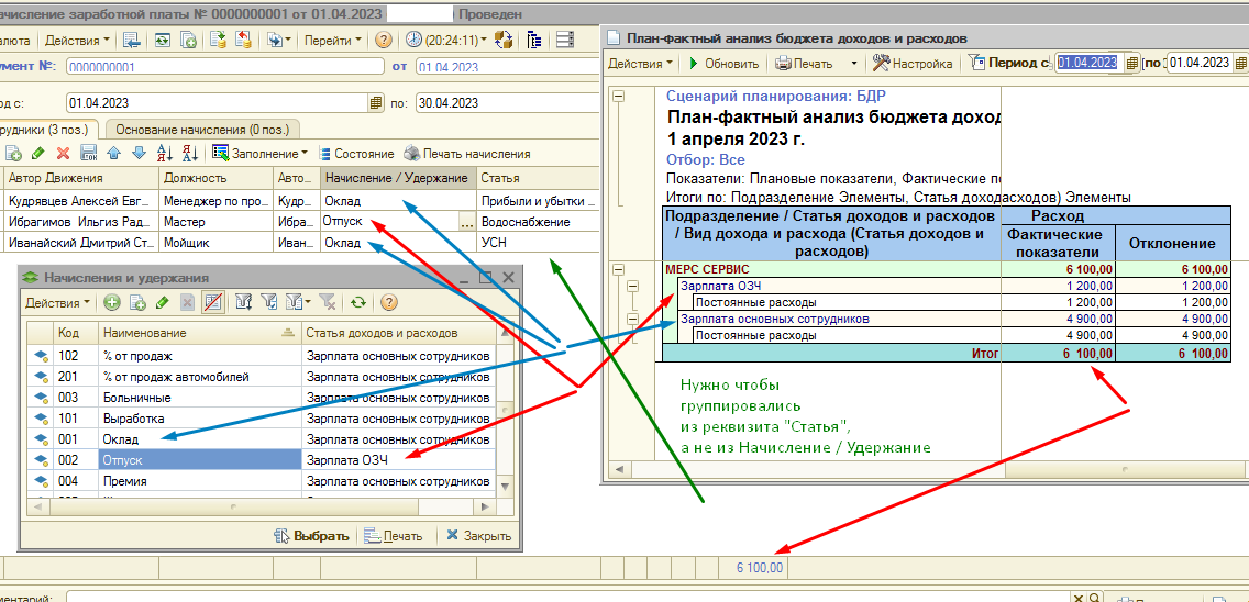 Нужно чтобы из поля "Статья" брались заполненные нами данные для группировки в отчете "План-фактный анализ бюджета доходов и расходов" (рис. 1). Сейчас данные берутся из поля "Начисление / Удержание", это мне не подходит (рис. 2).