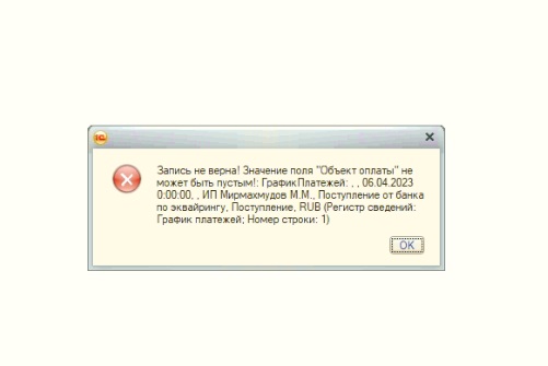 Запись не верна! Значение поля "Объект оплаты" не может быть пустым!: ГрафикПлатежей: , , 06.04.2023 0:00:00, , ИП Мирмахмудов М.М., Поступление от банка по эквайрингу, Поступление, RUB (Регистр сведений: График платежей; Номер строки: 1)