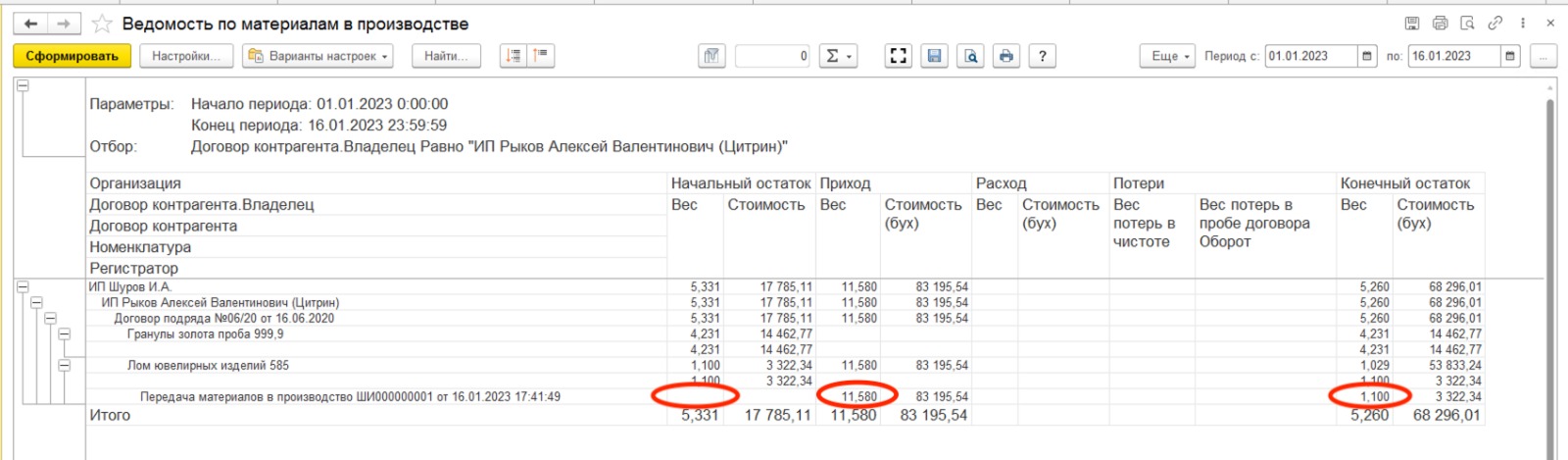 Для примера на фото показал, как сейчас работает штатный отчет. Начальный остаток 0гр, передали металл 11,58гр, конечный остаток 1,10гр. Как видим, остаток показывает кривой.