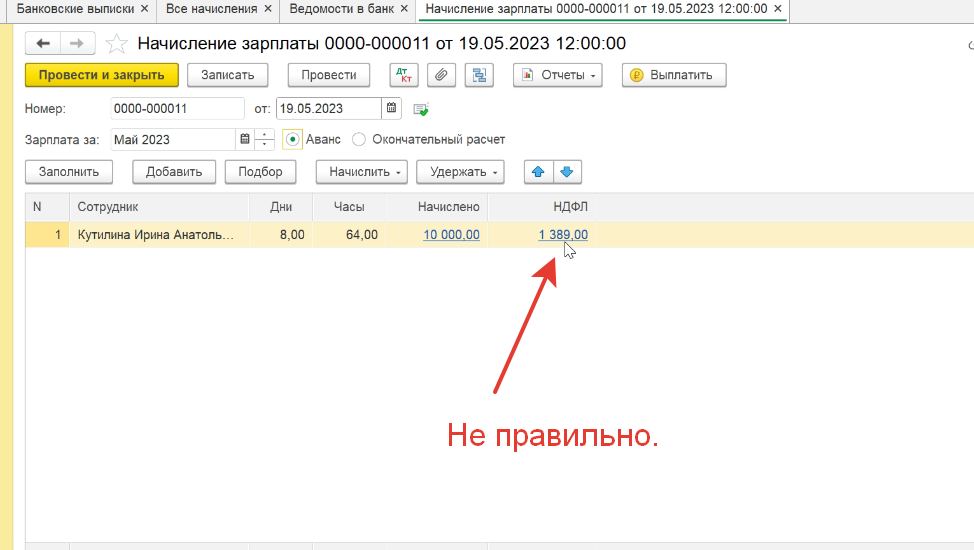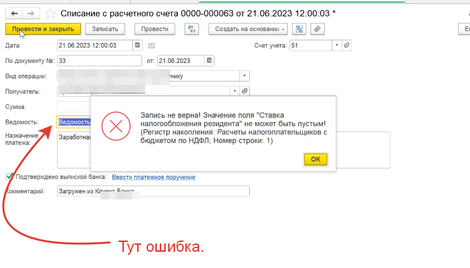 При проведении документа "списания с расчетного счета" при добавлении "ведомости" появляется ошибка (ошибка прикреплена).