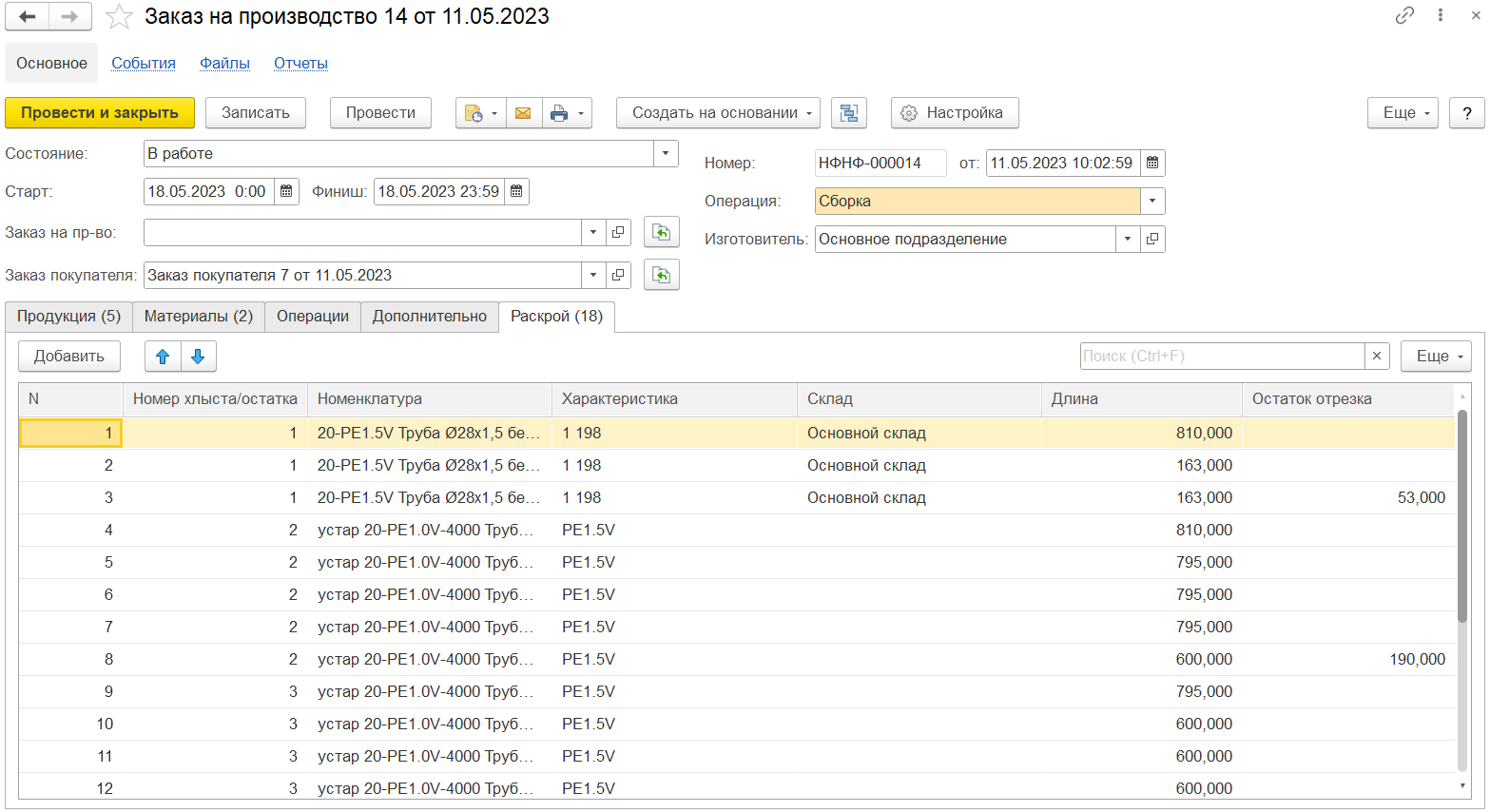Имеется расширение для УНФ. Доработан документ Заказ на производство, который имеет табличную часть Раскрой. С точки зрения бизнеса там содержится детальная информация на какие части и на сколько разрезать заготовку чтобы получить требуемые отрезки. Надо сделать печатную форму которая покажет как резать трубы (заготвки) на какие части. В качестве примера желаемого результата прикладываю срин с сайта (сервис раскроя). Нужна похожая форма из документа заказ.