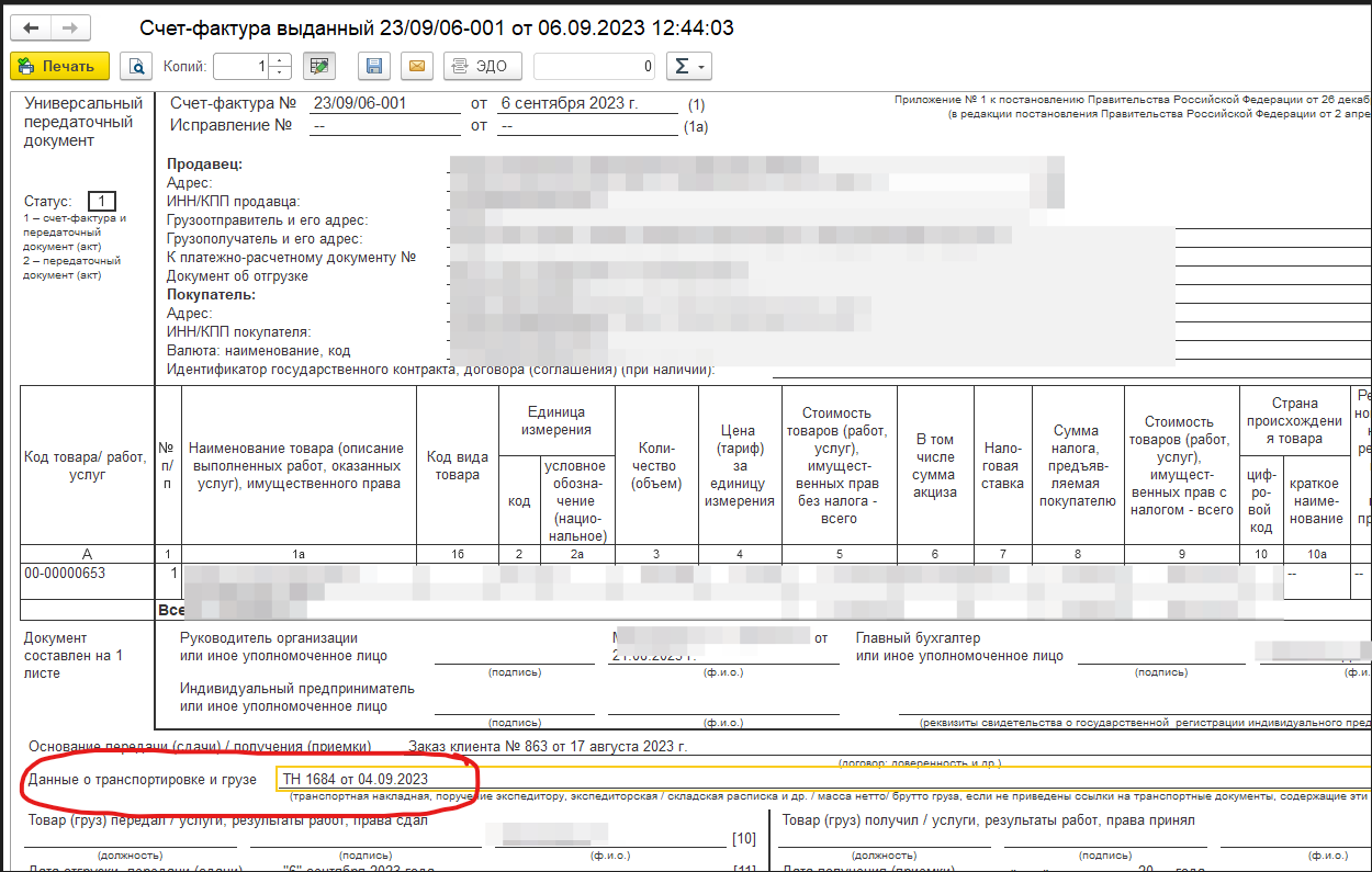 Задача: В 1С в печатной форме УПД у нас заполняется поле [9], данные берёт из Реализации товаров и услуг из Реквизитов для печати. При формировании УПД для СБИС ( т.к. данные не типовые ) они не попадают в это поле печатной формы. Необходимо доработать соответствующий файл настроек СБИС, что бы поле заполнялось.