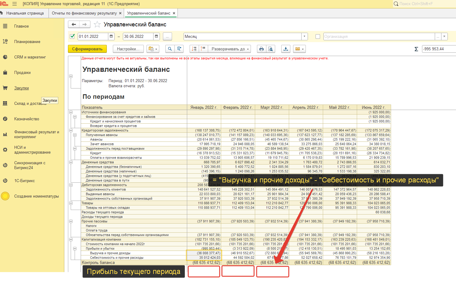 В отчете "Управленческий баланс" добавить строку "Прибыль текущего периода".
