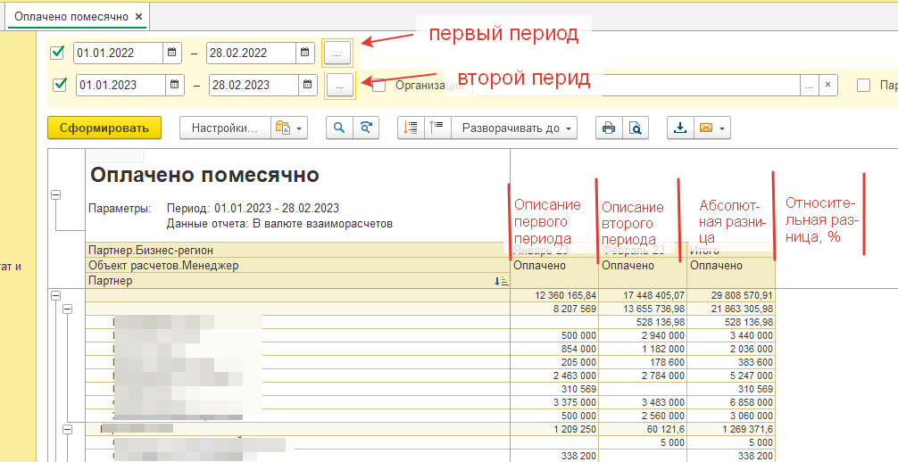 Необходимо добавить в этом отчете сравнение двух периодов в абсолютных и относительных величинах. На форме выбирается два периода, в колонки отчета выводится итог по первому и второму периоду, 3-я колонка абсолютная разница, 4-я – относительная разница (в процентах).