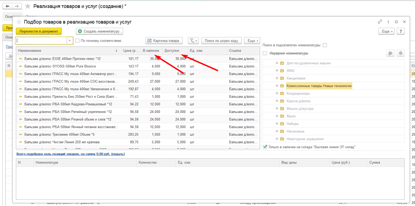В документах реализации в окне подпора товаров в графах "В наличии" и "Доступно" отображается весь доступный товар по данному складу (кажется, по регистру, "Остатки и доступность"), не опираять на остатки по организации. При этом, эта цифра может состоять из остатков не по той организации, по которой создается реализация, и в момент проведения документа выйдет ошибка, сообщающая, что не хватает товара по организации.