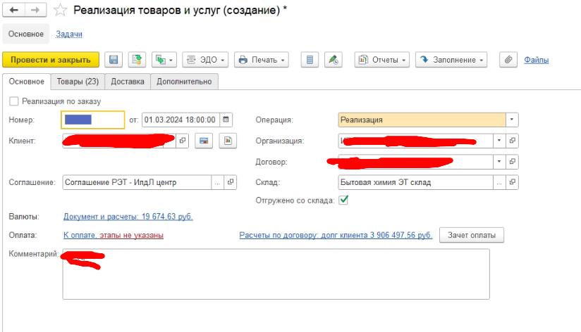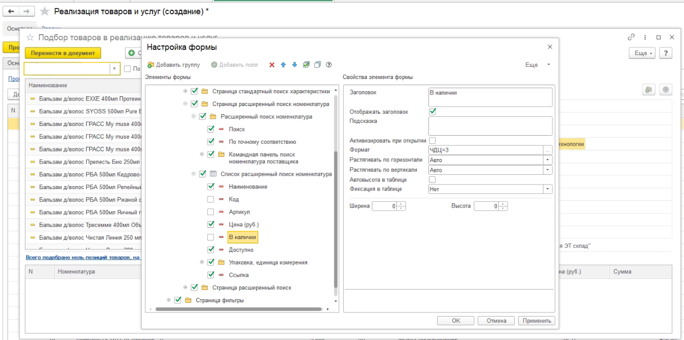 Задача: добавить в "Список расширенный поиск номенклатура" столбец, показывающий значение остатка данной позиции по регистру "Ведомость по товарам организации" на данном складе. Организация и склад указаны в саомм документе реализации во вкладке "Основное".