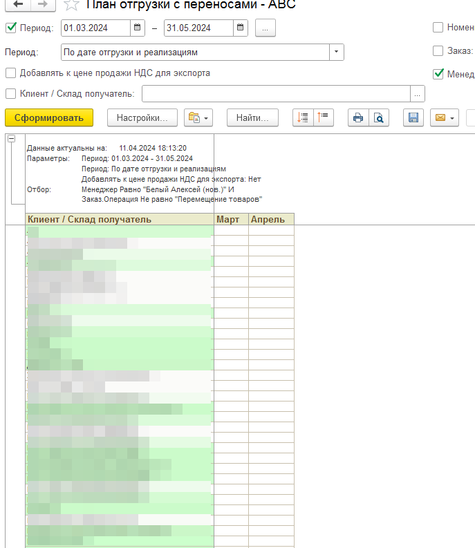 Требуется перенастроить отчет в виде таблицы: в строках клиенты, в колонках месяцы. На пересечении строк и колонок должна быть СуммаРуб. Все остальные поля из вывода можно убрать. На скриншоте примерно то, что нужно получить
