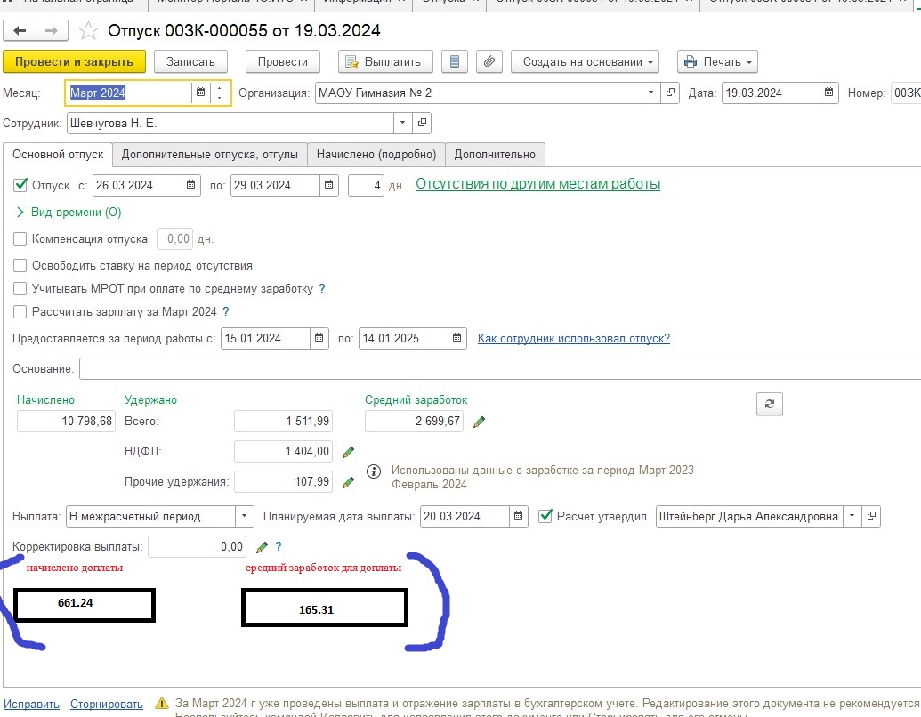 5) Рассчитываем доплату = 46658,19/282,25* Количество дней отпуска