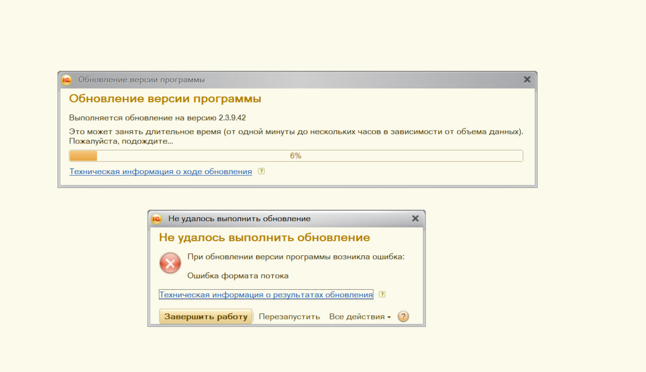 при обновлении конфигурации выдает ошибка формата потока при запуске 1с после обновления.