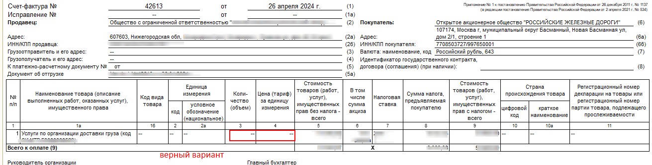 Также доработана печатная форма счет-фактура для РЖД, в которой необходимо, чтобы в этих же графах отображался прочерк