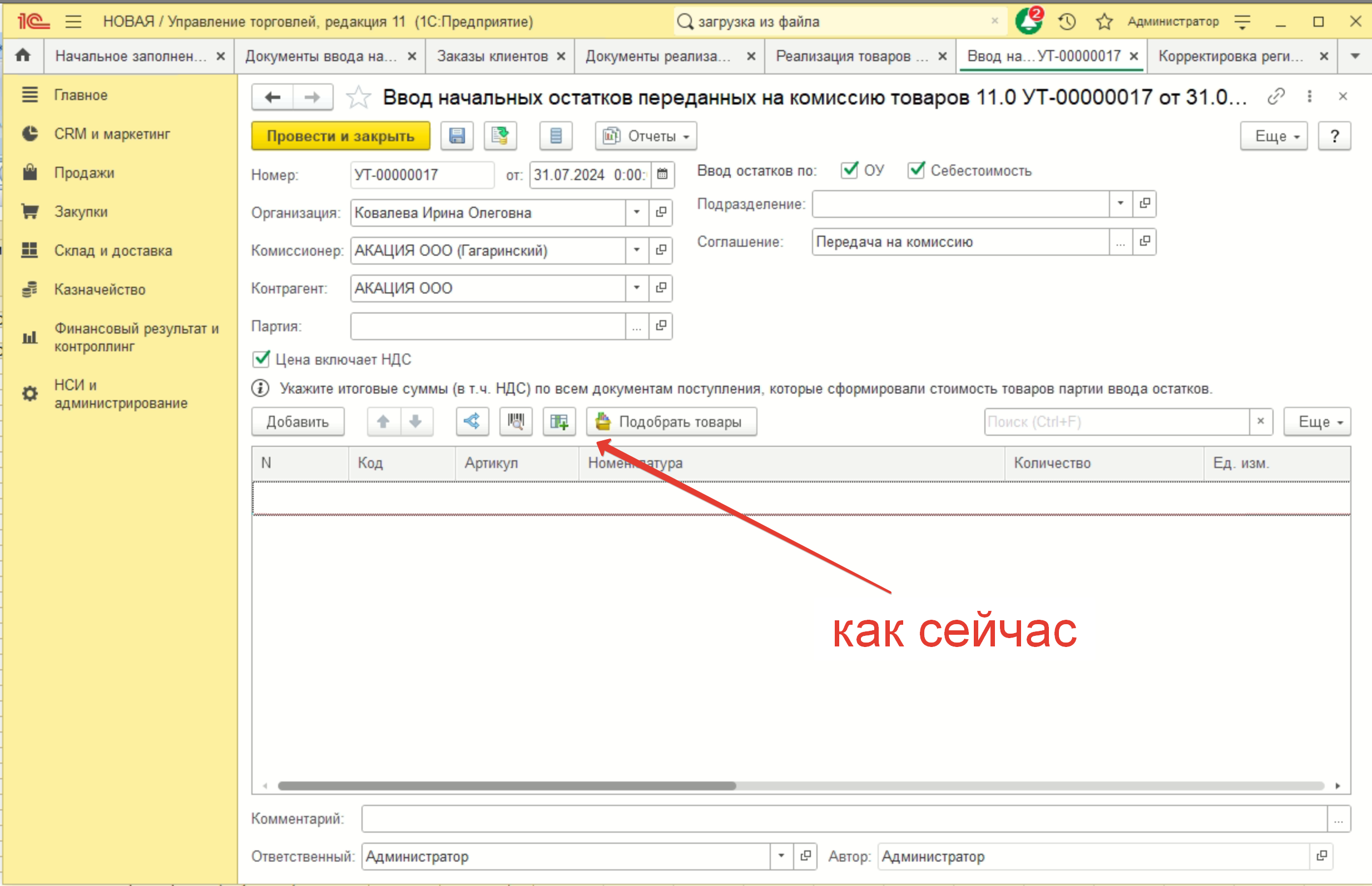 В разделе ввод начальных остатков товары переданные на коммисию, в табличной части нет кнопки "Загрузить из файла", необходимо добавить такую возможность. Либо перенести остатки "Товары переданные на коммисию" из старой базы или таблицы Эксель.