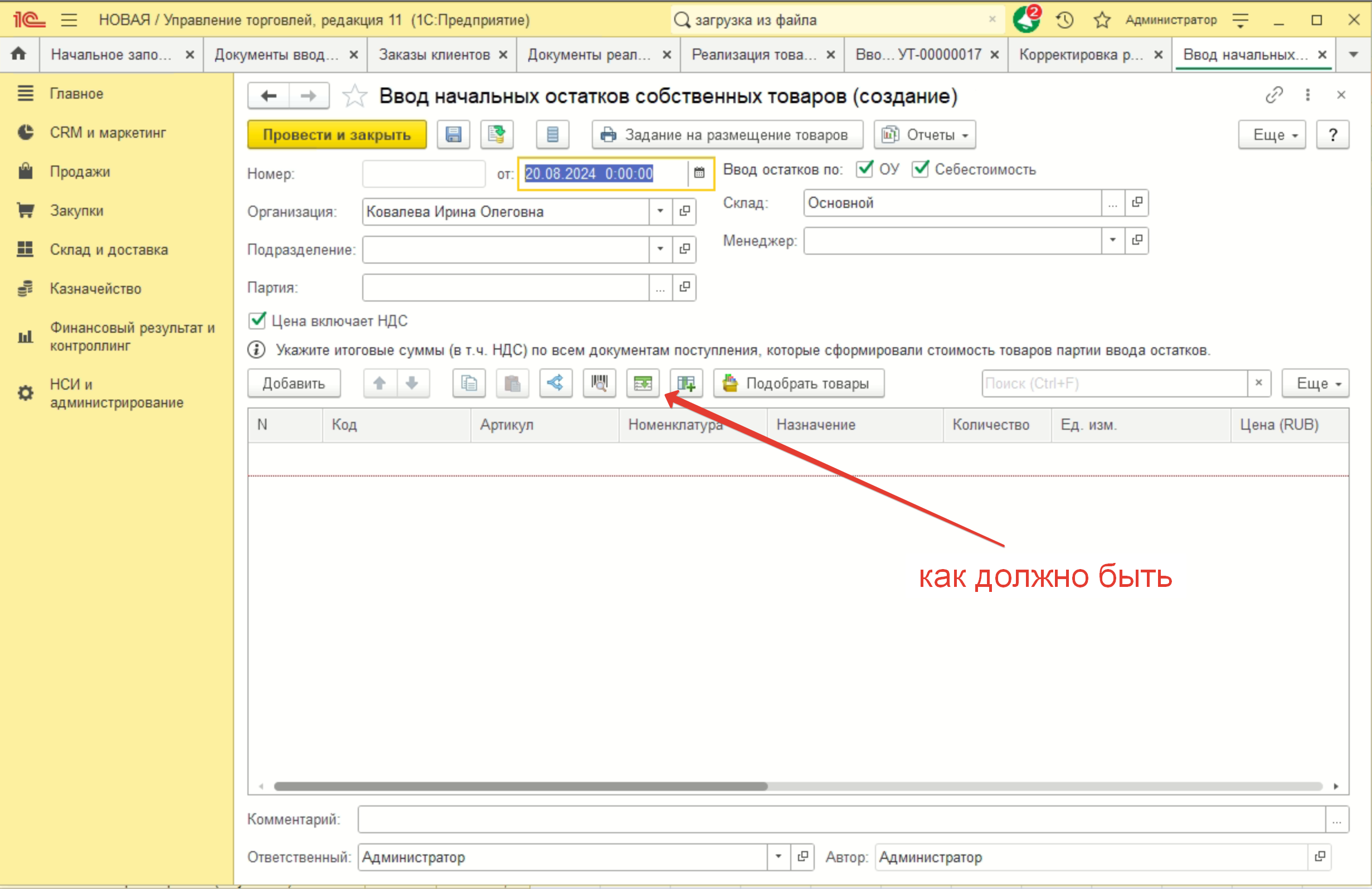 Сделать возможность загрузить из эксель ввод начальных остатков УТ 11