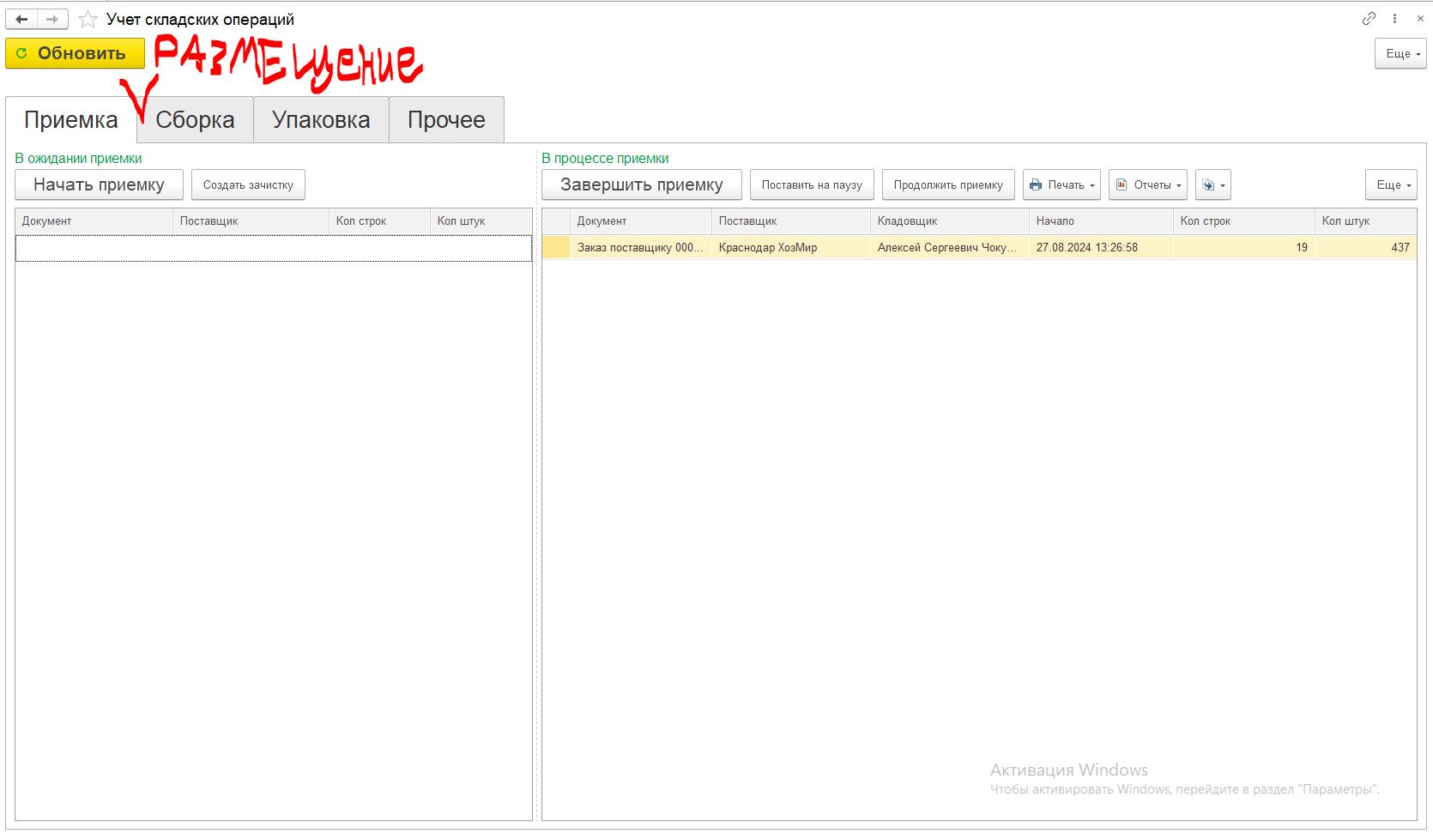 После записи в регистр документы должны попадать на следующий этап во вкладку «размещение». Нужно сделать похожую логику, как с документами «заказ от клиента». Скорее всего логика такая, что если заполнено поле «Конец приёмки», но не заполнены поля по размещению, тогда документ появляется во вкладке «размещение»