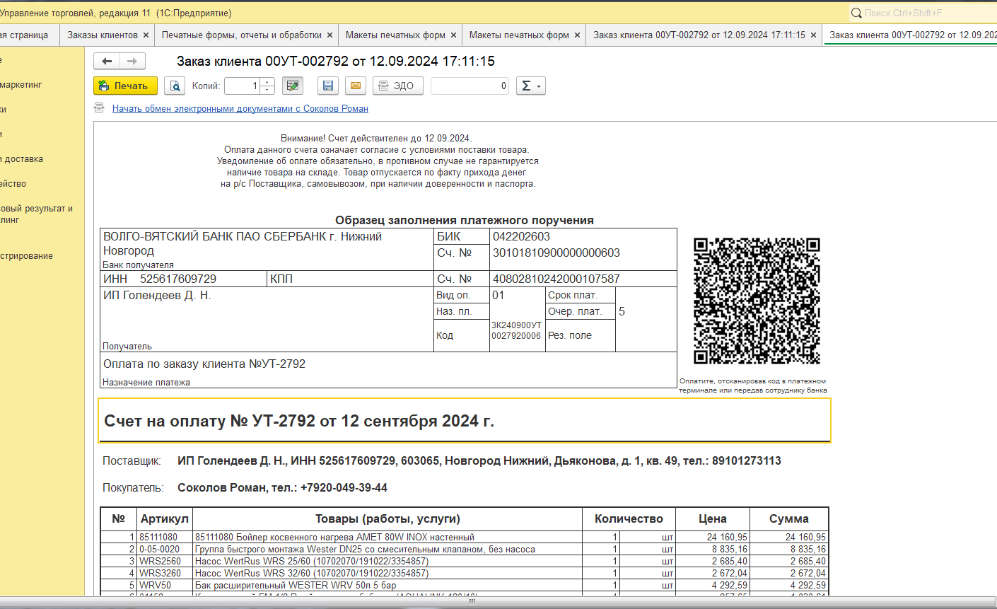 Вот для примера два скрина, в одном как обычная форма "Счет на оплату" с QR и реквизитами, а вот второй это то что бы хотели видеть (сейчас можно и в стандартной форме такое получить, но надо заходить в реквизиты печати в документе, там убирать всё и тогда она вот такая выводится, но конечно каждый раз так не удобно).
