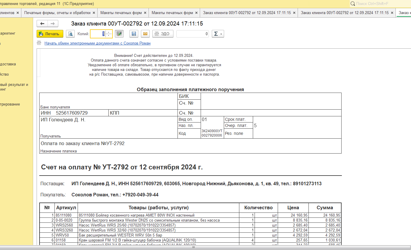 Нужно добавить в заказе клиента, в подменю печать ещё один пункт "Счёт на оплату(без РС)" - чтобы печатал без реквизитов оплаты и QR кода.