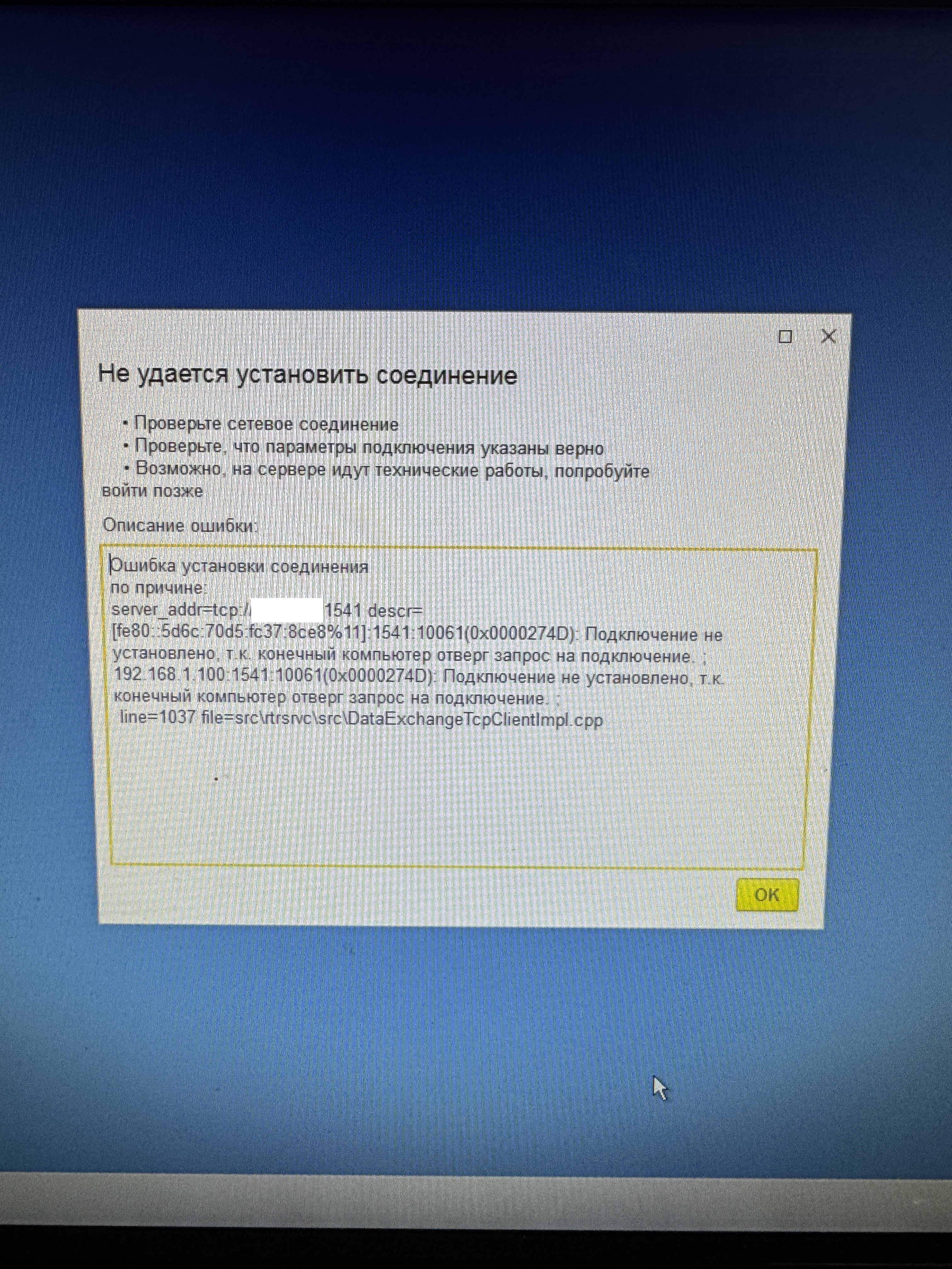 Необходимо устранить ошибку установки соединения по причине: sever_addr=tcp://....