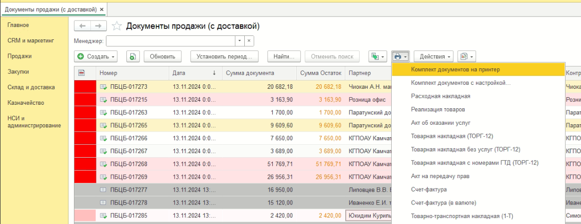 Изменить порядок печати комплекта документов УТ 11.4.6.188