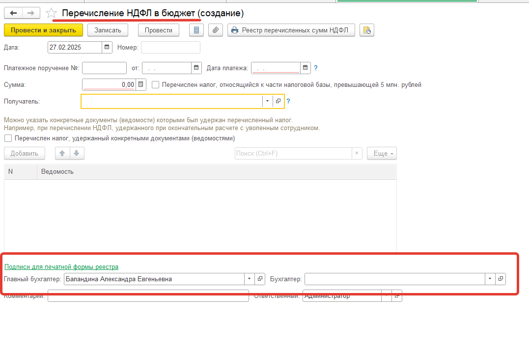 Есть типовой документ ПеречислениеНДФЛВБюджет, который имеет 2 реквизита для подписантов: ГлавныйБухгалтер и Бухгалтер, при этом нет возможности указывать их должность