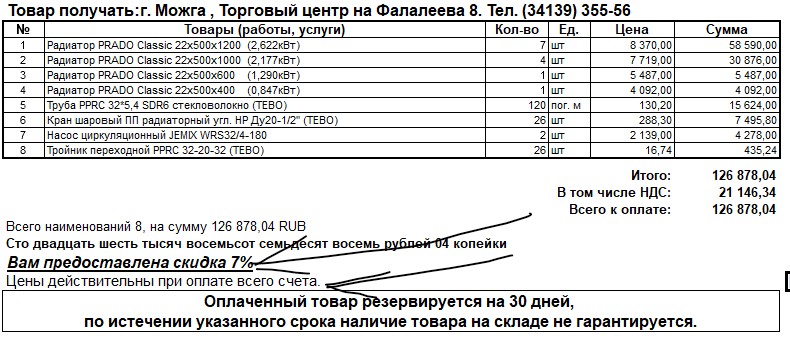 Под скидкой, указать "Цены действительны при оплате всего счета." (Пример надписи внизу)
