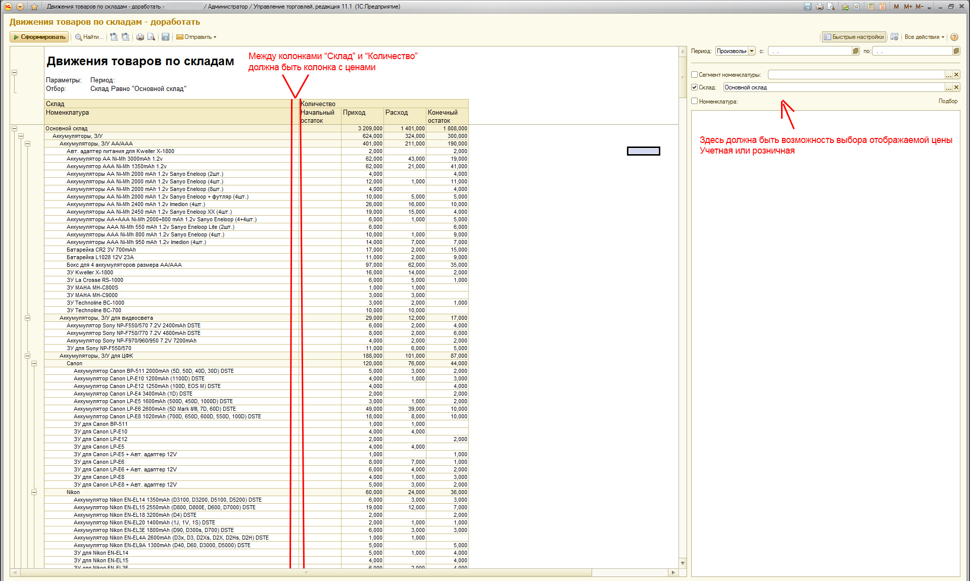 Доработка отчёта: "Движения товаров по складам" 1С 8.2 УТ 11.1