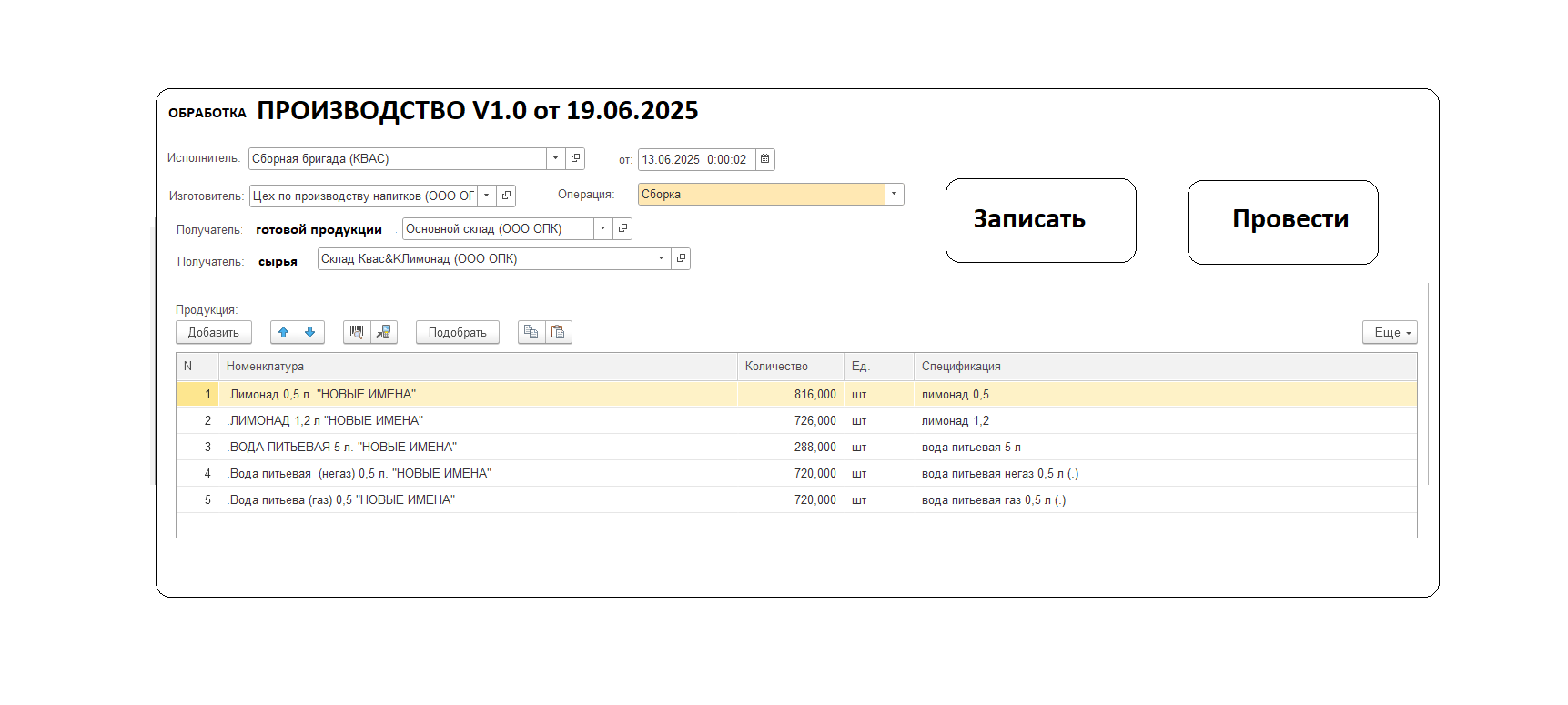 Создать обработку «ПРОИЗВОДСТВО V1.0», которая по нажатию кнопки «Провести» автоматически создаёт пакет из 4 документов: