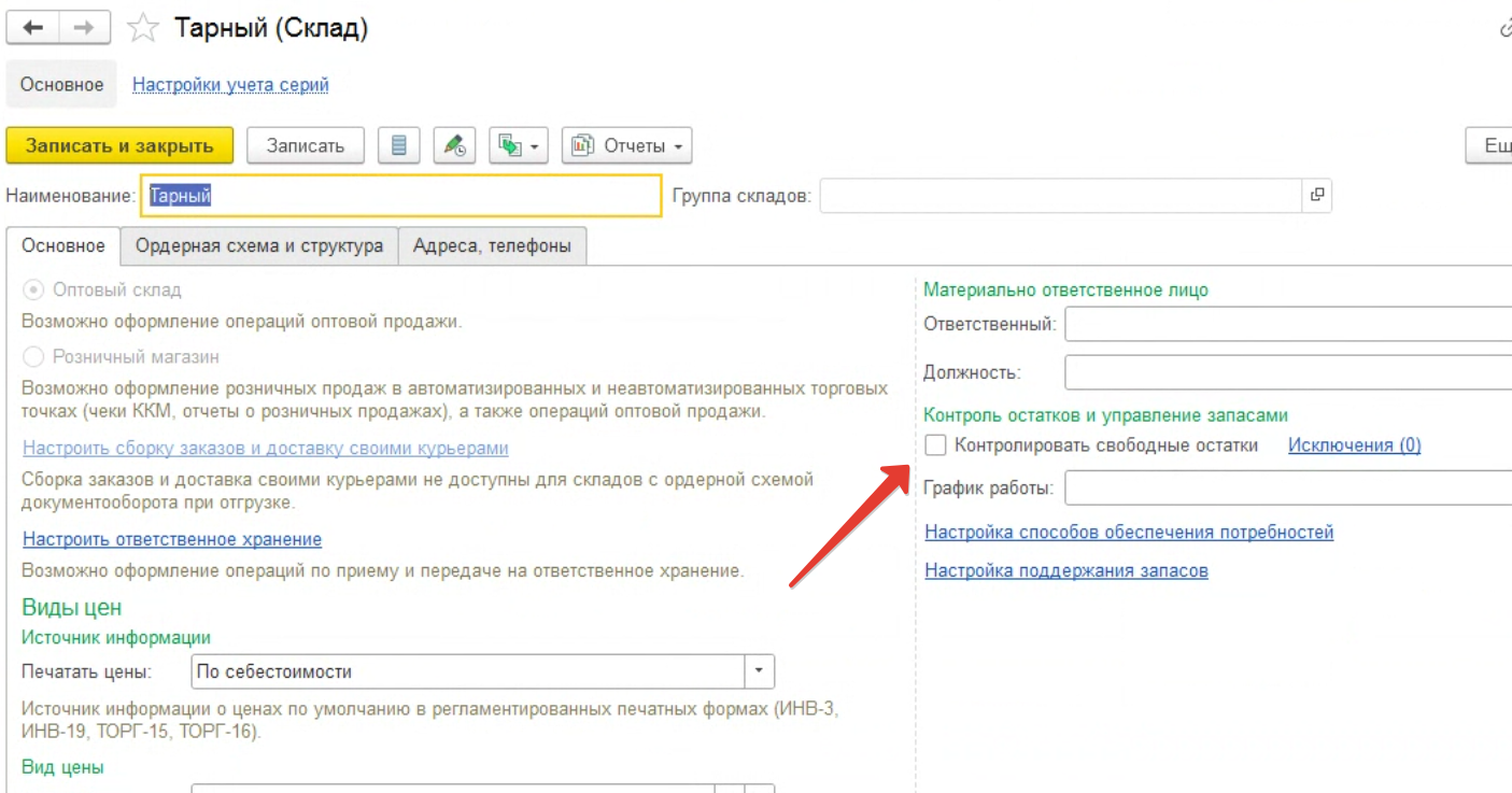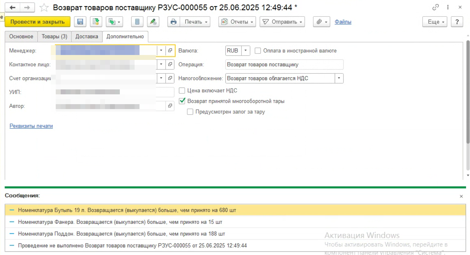 В программе отключен контроль остатков. Но при проведении документа возврат товаров поставщику (тара) ругается на остатки. Нужно доработать механизм, чтобы документ проводился в любом случае.