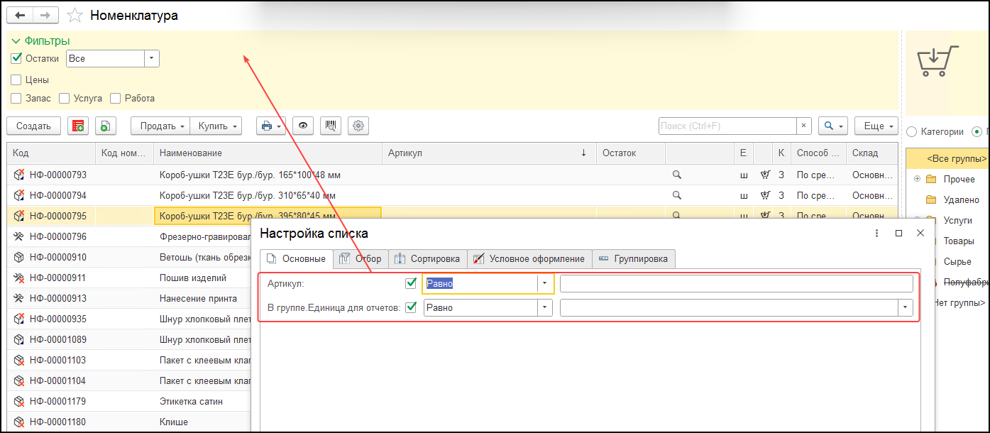 Добавить отборы на форму списка номенклатуры в УНФ