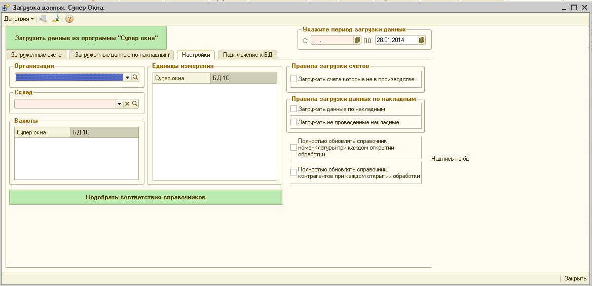 Перед созданием документов программа подбирает соответствия справочников организаций, складов, валют и единиц измерений.