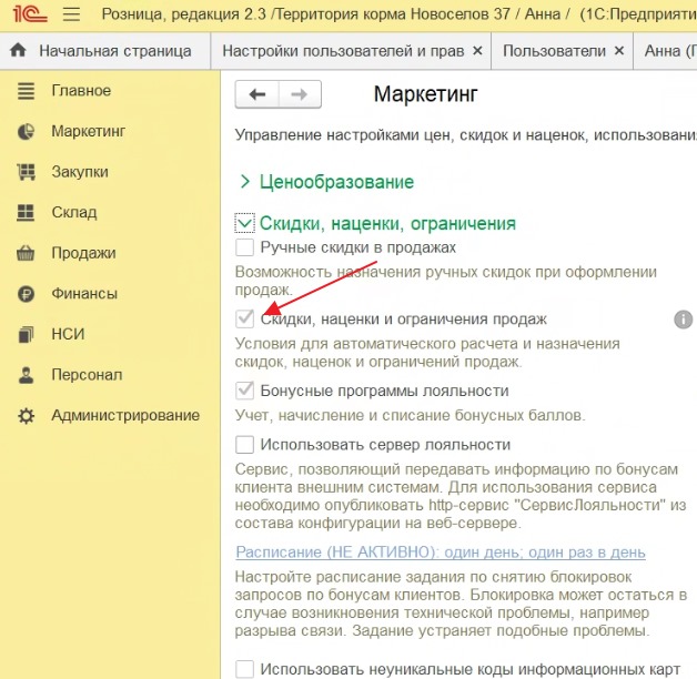 Задача на включение галочки "ручные скидки" в 1С розница