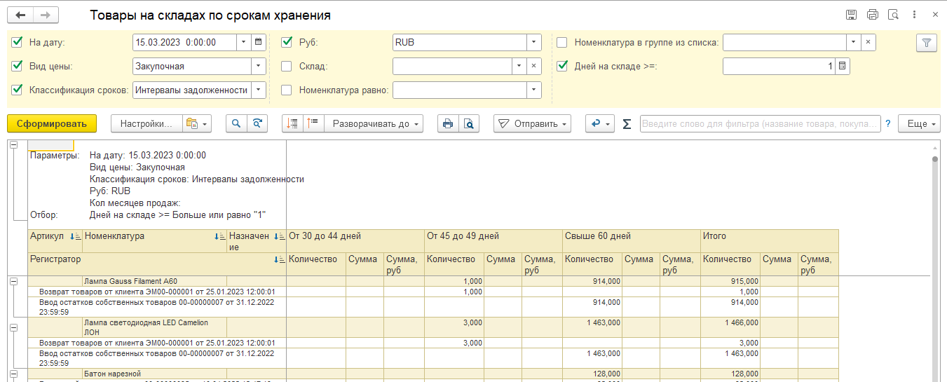 Нужно изменить дату на период, добавить колонки пример: (до 1мес, до 2мес до 6мес) с указанием остатка товара который поступил в указанный период. Скрин отчета как сейчас выглядит приложил к заданию.