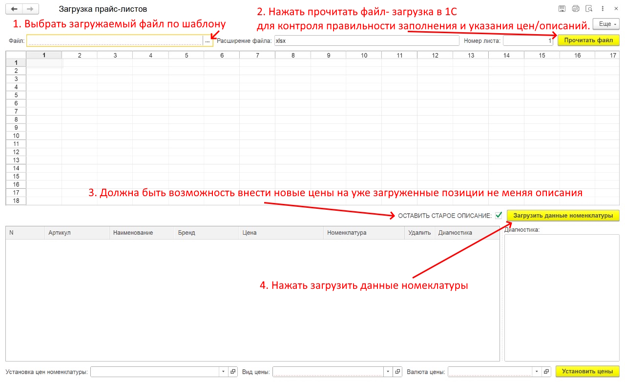 Нужна дополнительная обработка для внесения номенклатуры с необходимыми данными (артикул, рабочее наименование, бренд и стандартные одинаковые параметры такие как ставка НДС, вид номенклатуры и прочее) цветами всё выделил и подписал.