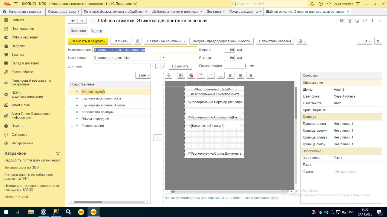 Дополнительные поля "Этикетка для доставки" УТ11.5.23