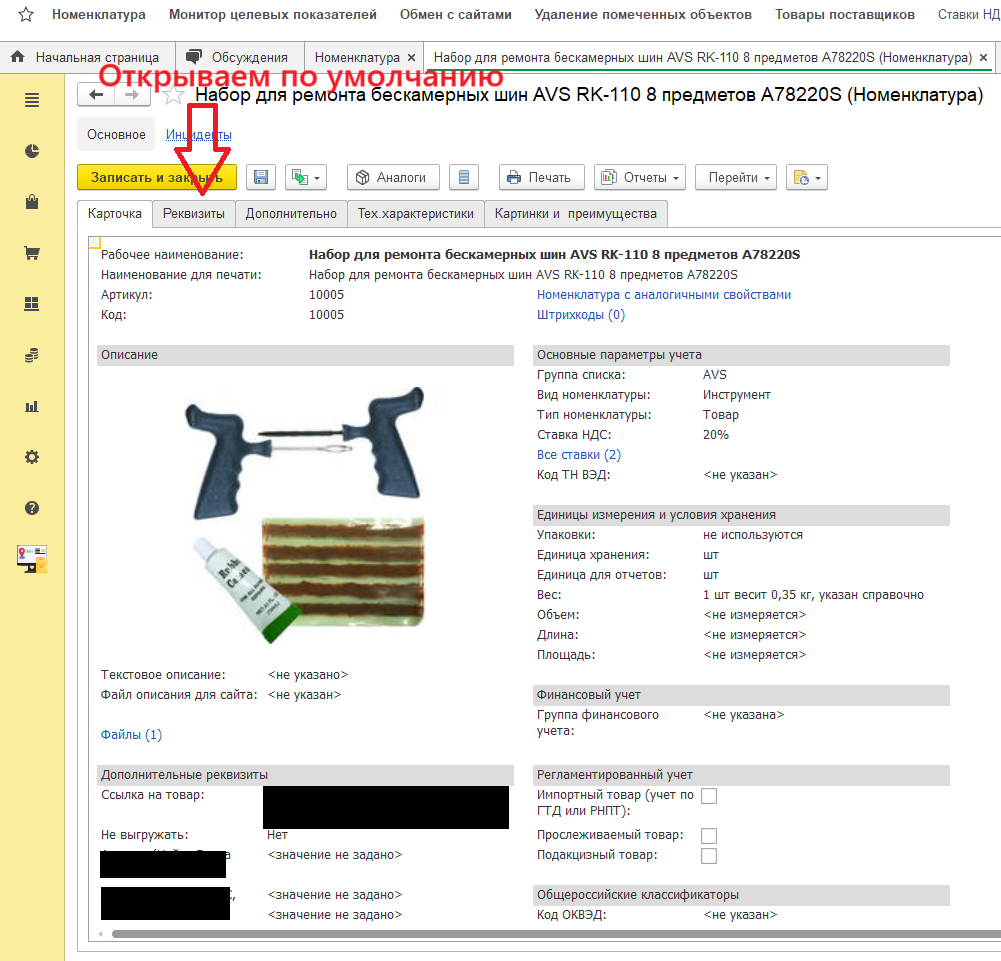 УТ 11.5, В карточке товара сделать вкладку "Реквизиты" открываемую по умолчанию