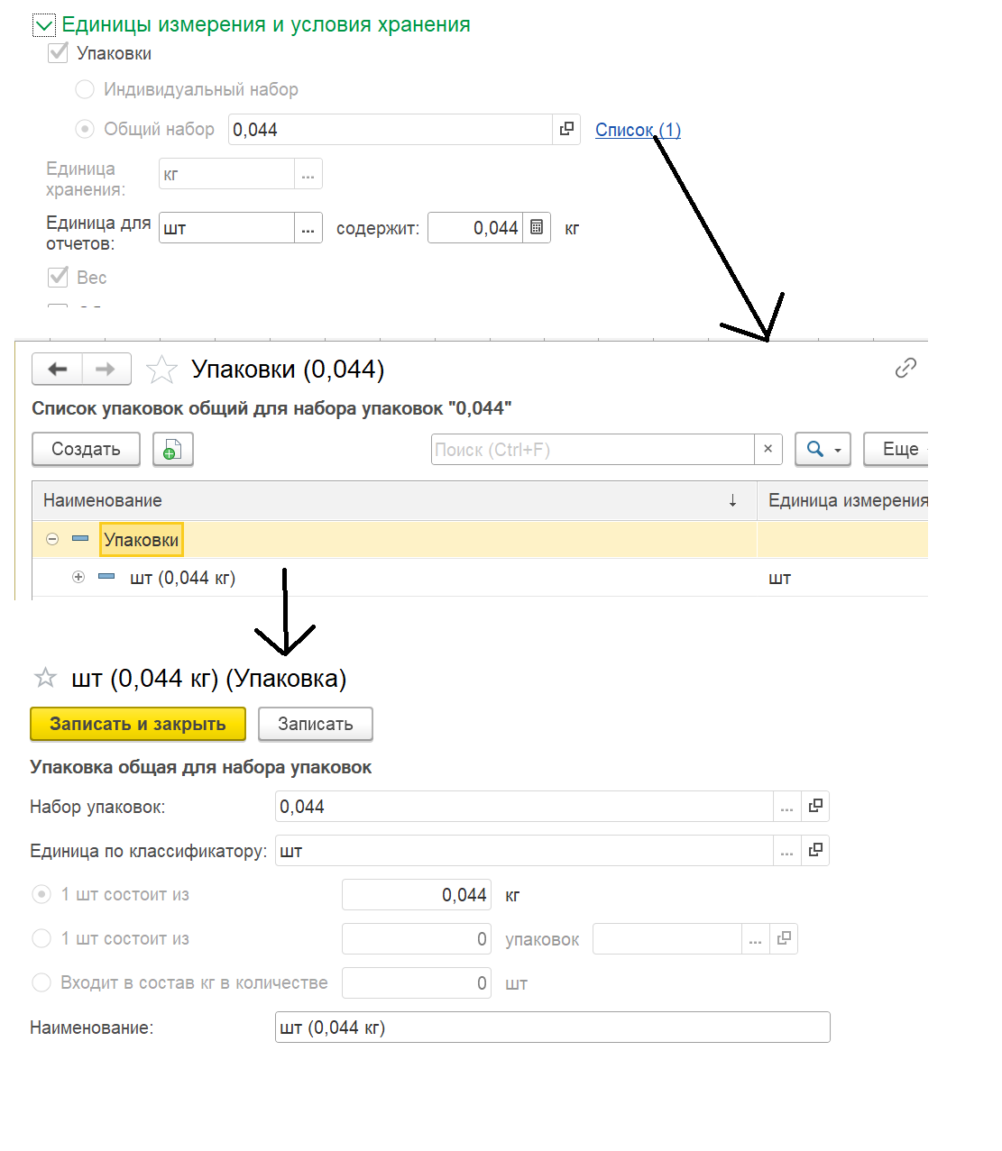 В карточке номенклатуры указана единица хранения кг. Создана индивидуальная упаковка 1 шт - 0,044кг (скриншот прикреплен)
