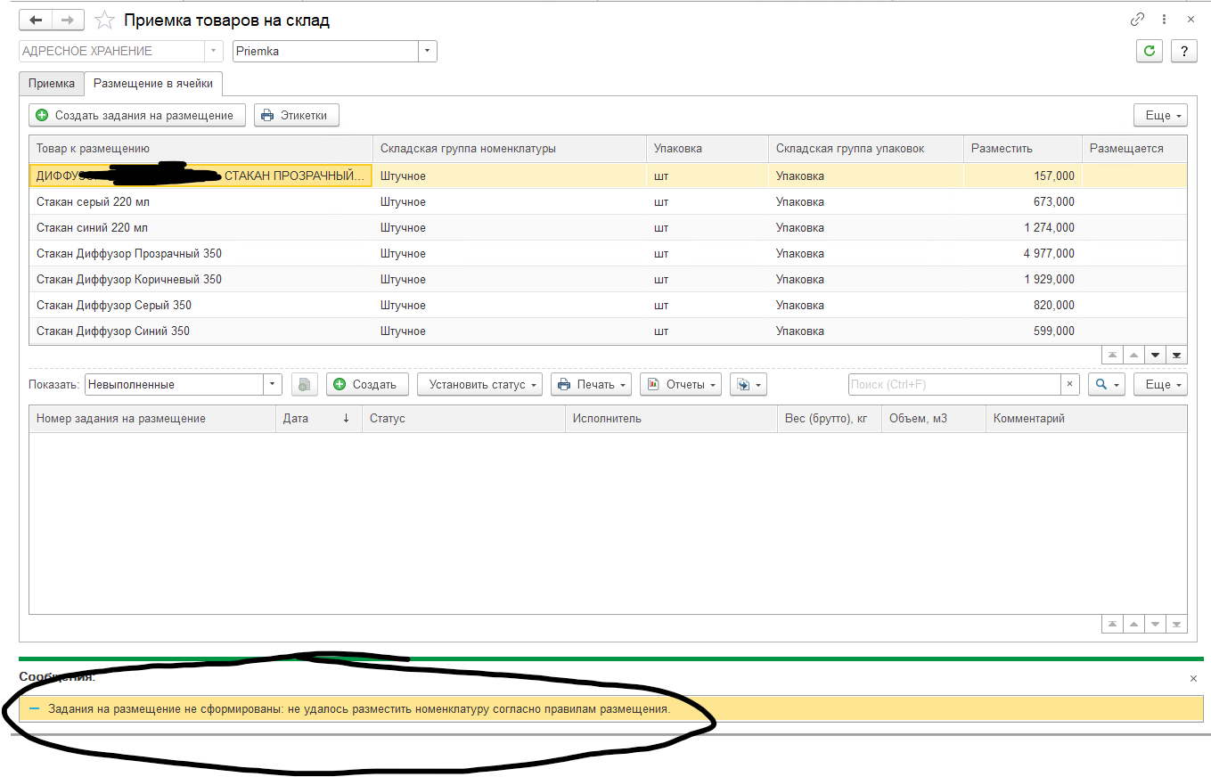 Сделали упаковки для товаров, переместили товары на адресный склад. Не можем сделать приемку на него и продать с него ничего не можем. Нужна помощь. Примерные ошибки в скришноте.
