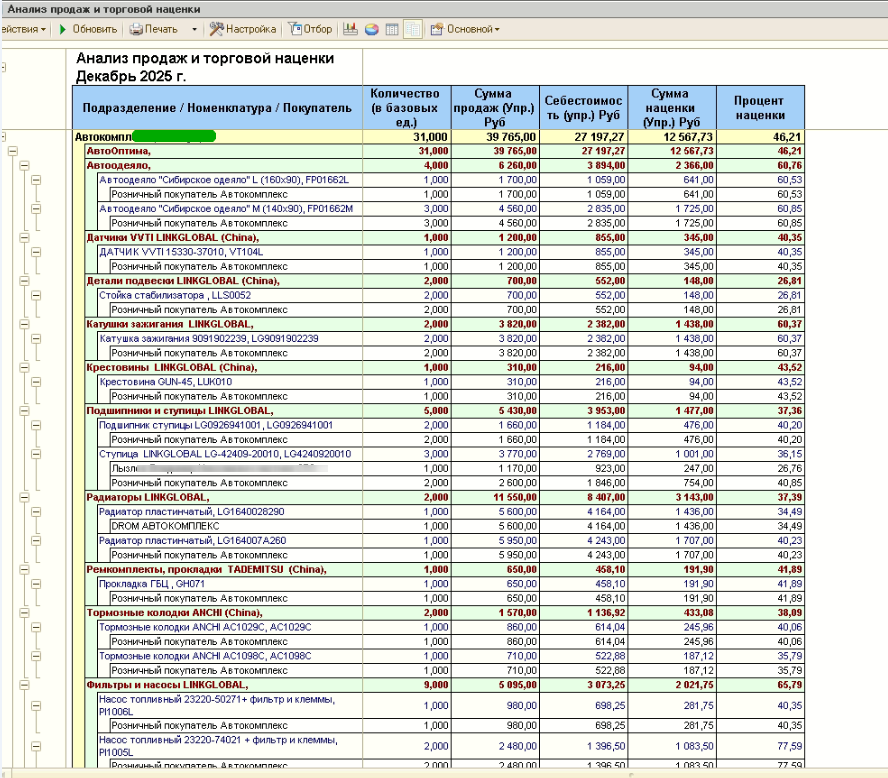 Необходим отчет по анализу продаж и вычислении торговой наценки в разрезе Организация\\\\\\\\\\\\\\\\Склад\\\\\\\\\\\\\\\\Номенклатура\\\\\\\\\\\\\\\\Покупатель