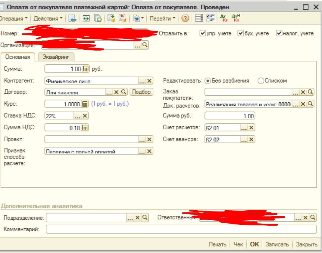 День добрый, есть касса Онлайн-касса АТОЛ 35Ф ОСВ, 22%, оплата происходит из платежного поручени, по нажатию на кнопку чек. И есть Управление производственным предприятием, редакция 1.3 (1.3.120.1).