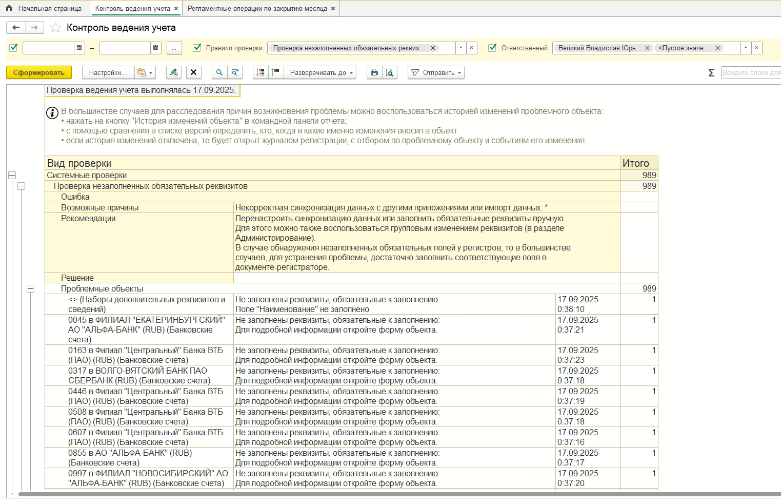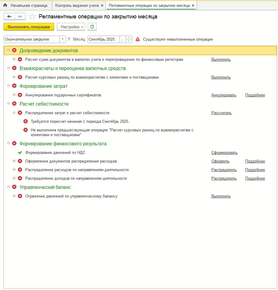 В текущих делах есть отчет "Некорректные данные" (скрин приложил) в нем как раз есть ошибки. Думаю дело в них. Помогите разобраться почему 1С не может закрыть месяц начиная с сентябрь 2025 года.