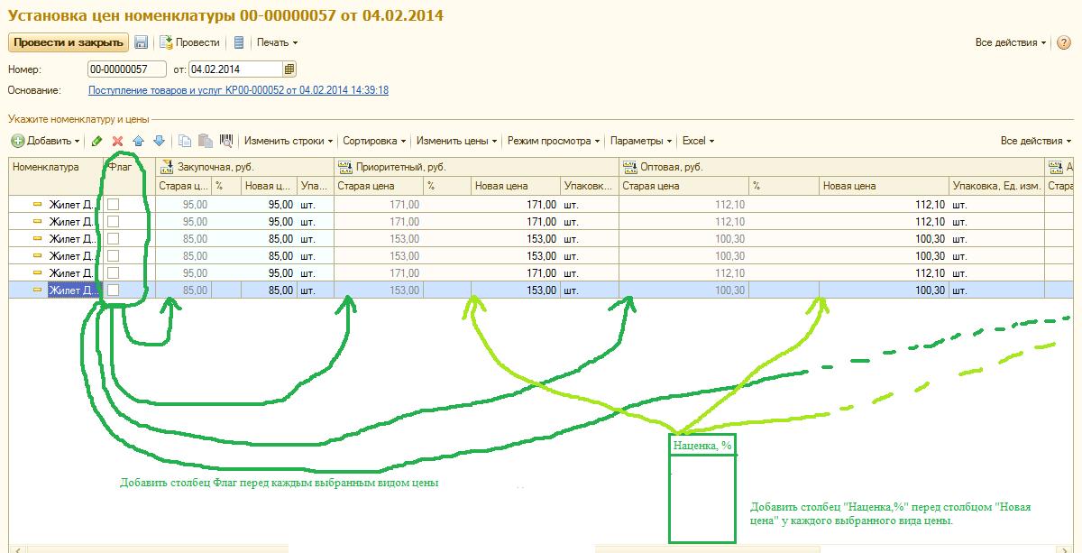 Необходимо доработать: Перед колонкой "Старая цена"( для каждого выбранного типа цены) должен выводиться аналогичный столбец "Флаг". При проведении документа для каждой номенклатуры должны регистрироваться только те виды цен, возле которых установлен соответсвующий флаг.