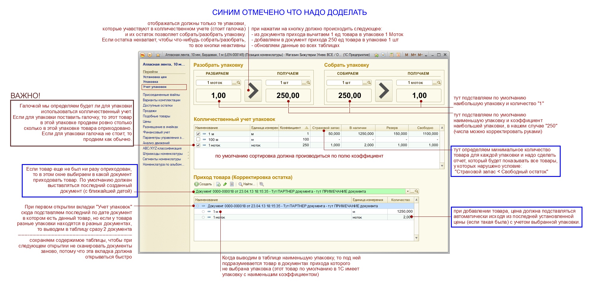 Второй пункт сделан практически полностью, для этого был сделан альтернативный регистр накопления (СвободныеОстаткиУпаковки), в который заносятся остатки в разрезе упаковок для каждого товара и если для какого-то товара для конкретной упаковки стои ограничение по продаже в упаковках, то остатки берутся из этого регистра. По этому пункту необходимо лишь поиспровлять некоторые ошибки. Остальные пункты надо доделать.