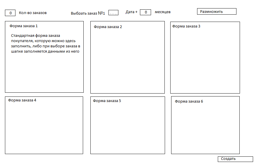 5) Кнопка "Создать". Создает заказы, согласно заполненной информации в формах заказов на обработке. Если Форма заказа 1 была выбранна из существующих то вносит в неё изменения при необходимости, если её заполнили в обработке то соответственно создает новый заказ.